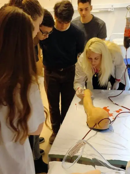 Örömmel fogadtuk a Varga Katalin Gimnázium diákjait, akik ápolástan és anatómia órán vehettek részt. Vizsgáltak pl. végtag preparátumot, hogyan helyezkednek el az izmok, inak egy valódi emberi karban vagy lábban. A művégtagokon pedig kipróbálhatták, hogyan kell vénát biztosítani branül behelyezéssel, de vettek vért és injekciót is adtak. Jó volt látni a kíváncsi arcokat és örültünk, hogy ezeknek az érdeklődő fiataloknak bepillantást adhattunk az egyetemi oktatásba.