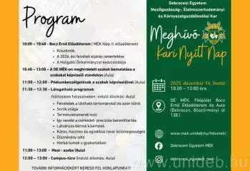 Minden, amit a 2026-ban induló agrárképzésekről, felvételiről és egyetemi életről tudni érdemes – egy helyen, a Debreceni Egyetem Mezőgazdaság-, Élelmiszertudományi és Környezetgazdálkodási Kar nyílt napján. December 16-án, kedden interaktív előadásokkal, bemutatókkal kínál átfogó tájékoztatást a kar, támogatva a pályaválasztás előtt álló fiatalok megalapozott döntését.